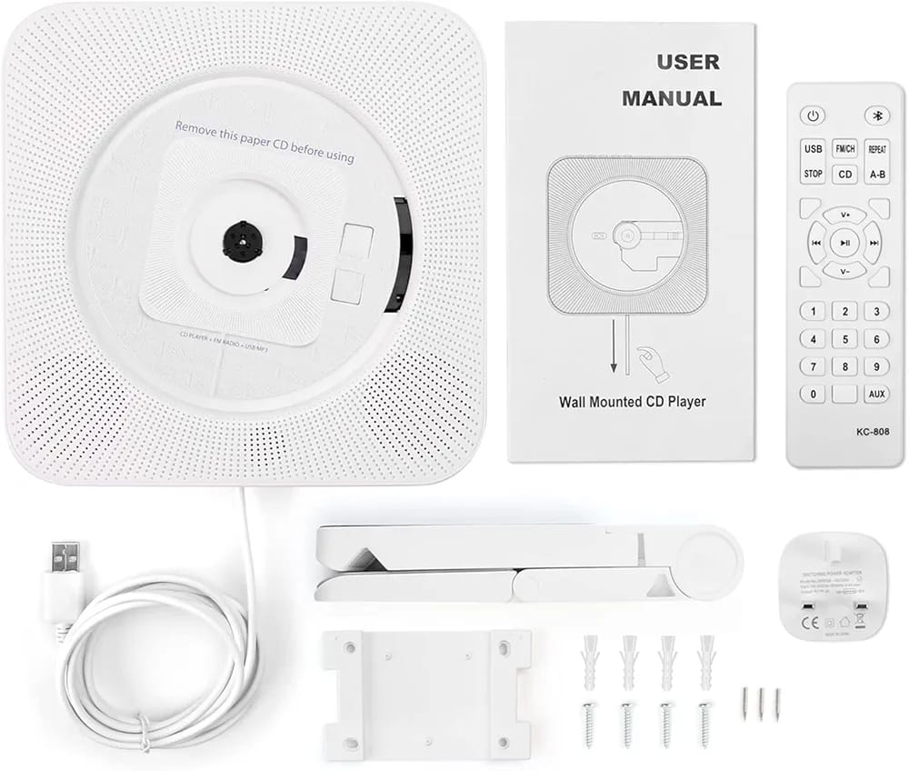 Package & Warranty:1 x Portable CD Player, 1 x USB Adaptor, 1 x Remote control ,1 x Wall-mounted kit, 1 x Wall-mounted plate, 1 x Desk stand, 1 x 3.5mm male to male audio jack cable, 1 x User Manual.