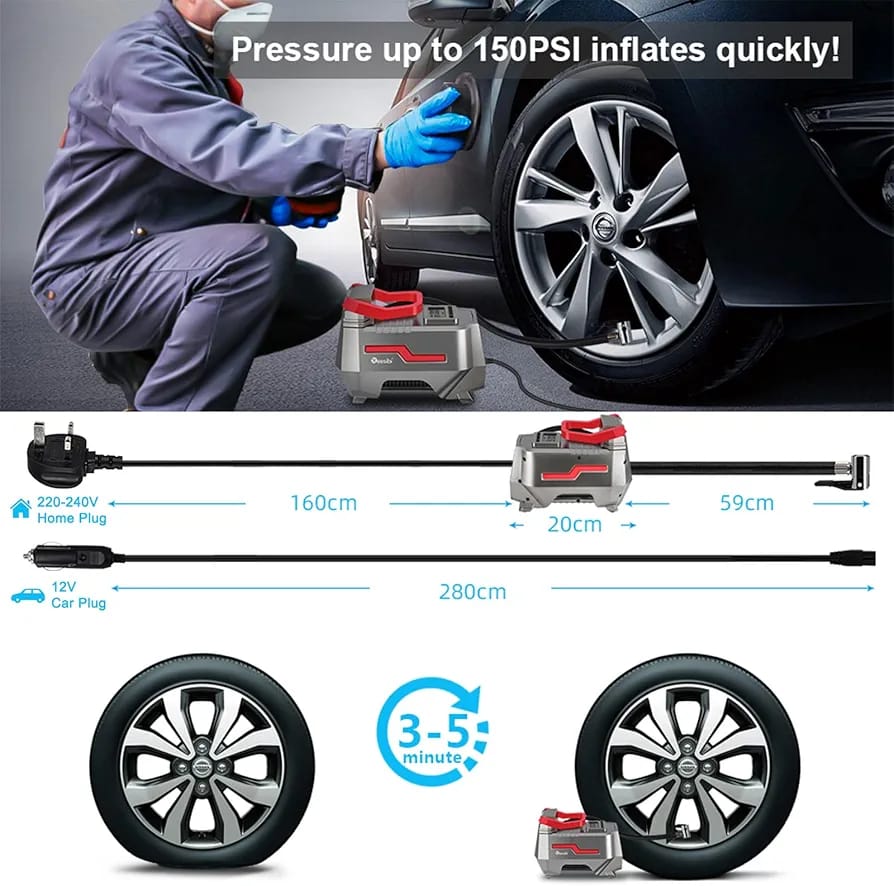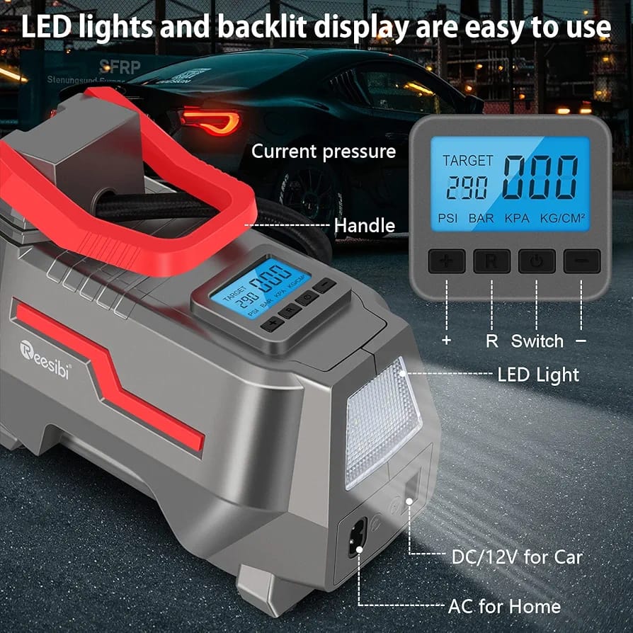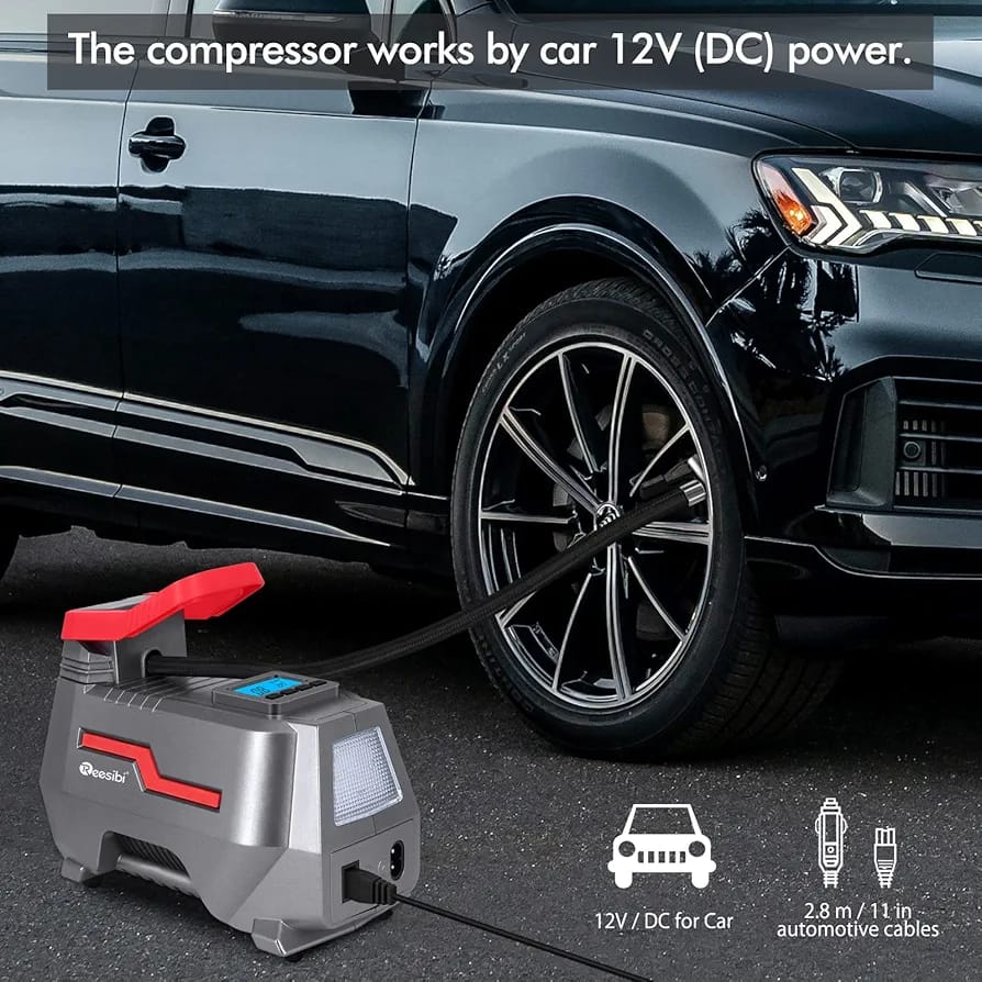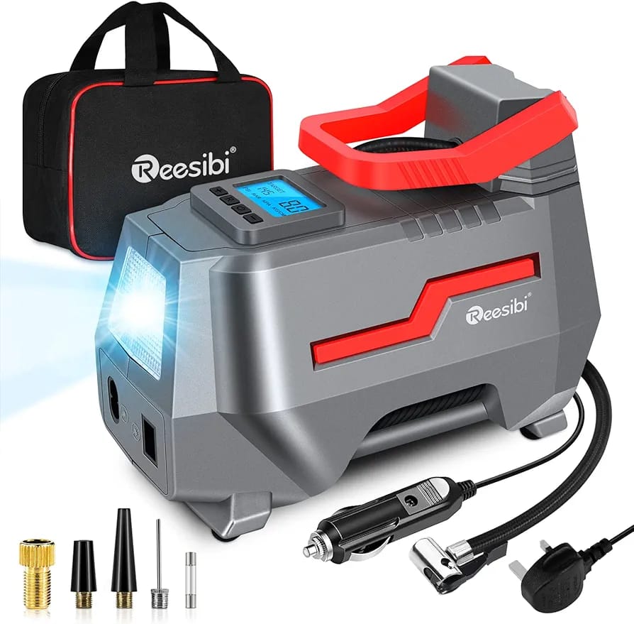 Reesibi Car Tyre Inflator Portable: this car tyre inflator comes with a unique AC/DC dual power supply function, that works with 12V car cigarette light plug as well as 220-240V wall plug for home outlet. The powerful motor delivers all the power you need to get the job done without sacrificing portability, and the compact size makes it easy to put in your car’s trunk without taking up too much space.