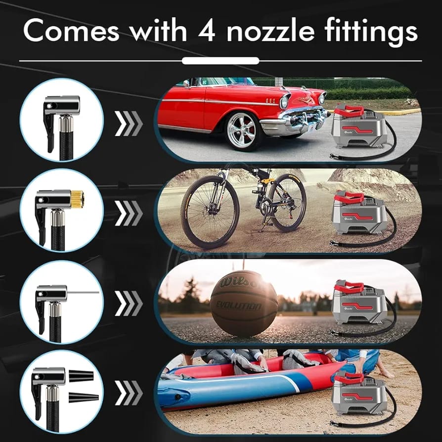 The tyre inflator air compressor is very versatile, compact, lightweight, and easy to use, comes with an increased air hose, 4 nozzle fittings and AC/DC cable, You can easily inflate tires of cars, bikes, sedan and midsize SUV, footballs, paddling pools or inflatables. Compact and portable & Multi-purpose inflating.