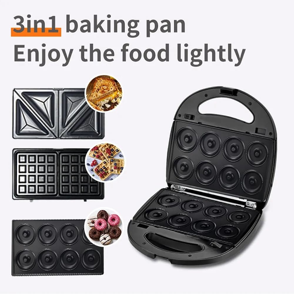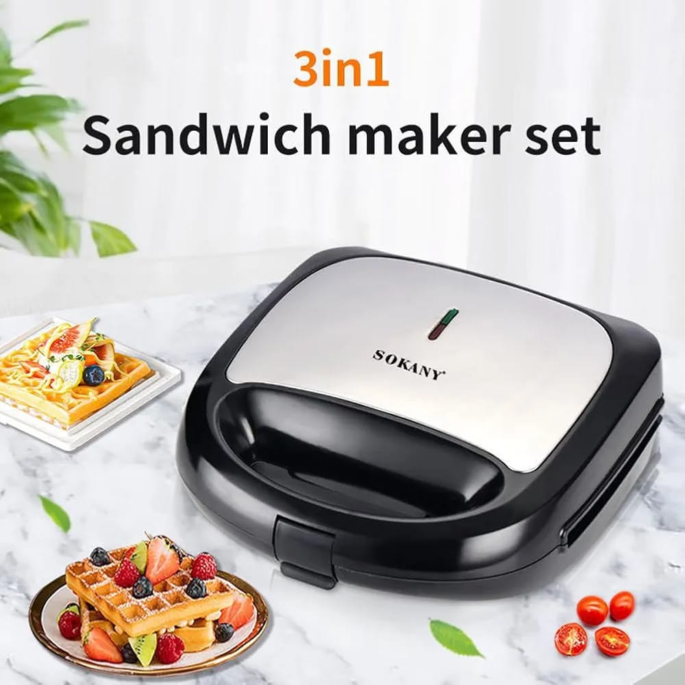 SOKANY 750W Sandwich Maker, Waffle Maker Set with 3 Removable Non-Stick Plates, Portable Handle, LED Indicator Lights, for Breakfast Sandwiches Mini Waffles, Donut, Black.