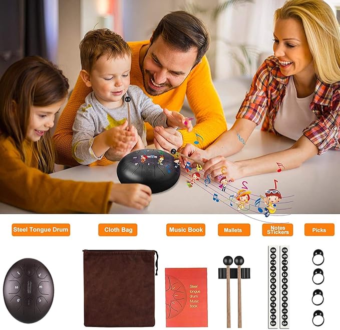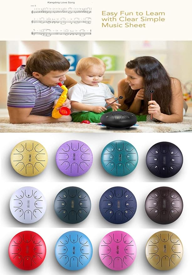 • EASY TO LEARN & PLAY – Beginners can learn how to play in ten minutes by using textbooks. You can play 8 notes steel tongue with the rubber topped mallets included or simply with your hands. This tongue drum is more suitable for direct hand tapping. We hit it with drumsticks, the tongue drum sound will be slightly off.
