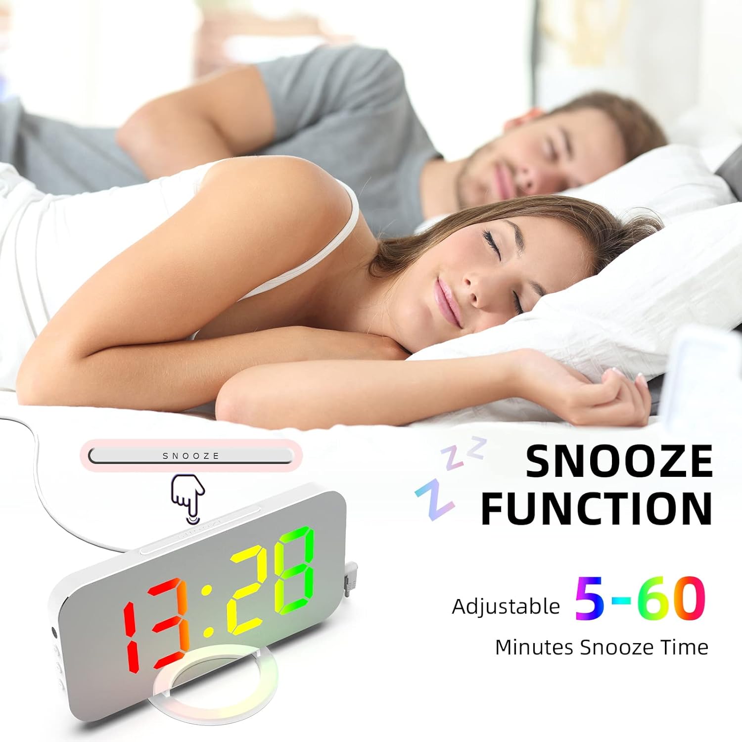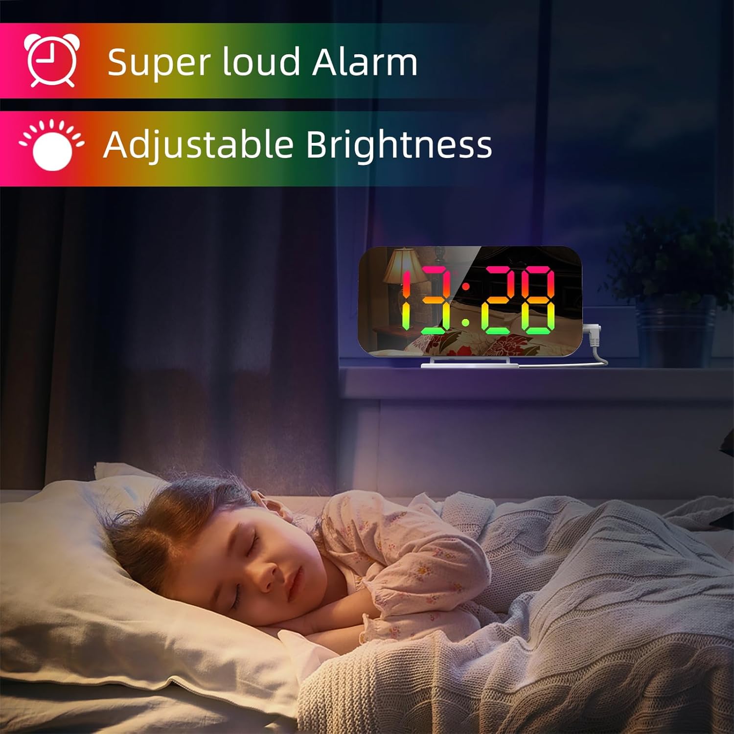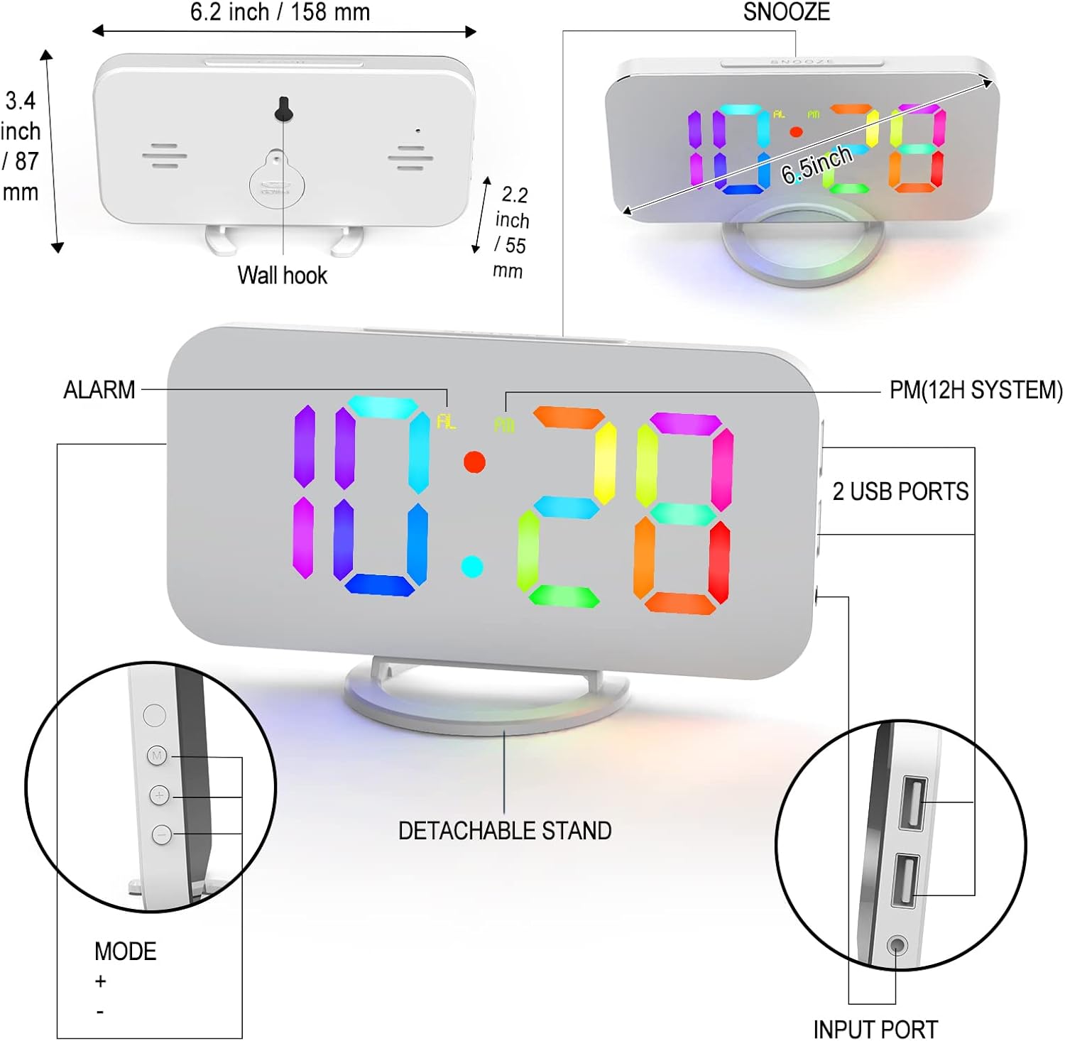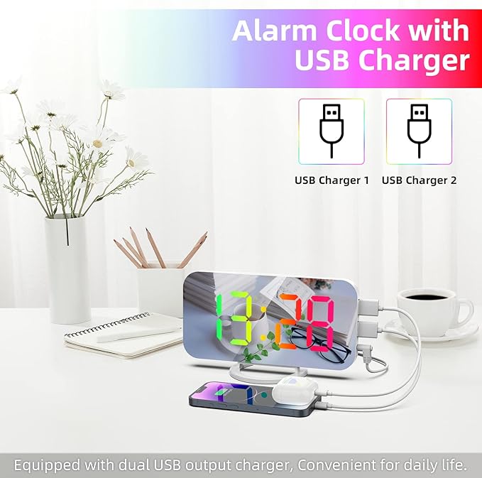 - ⏰ Dual USB Ports & Memory Setting–The RGB desk alarm clock is powered by DC 5V power supply, with 2 USB ports, which allows you to charge two devices at the same time.It has a built-in CR2016 battery,when the alarm clock is off,no need to reset your time and alarm clock setting.