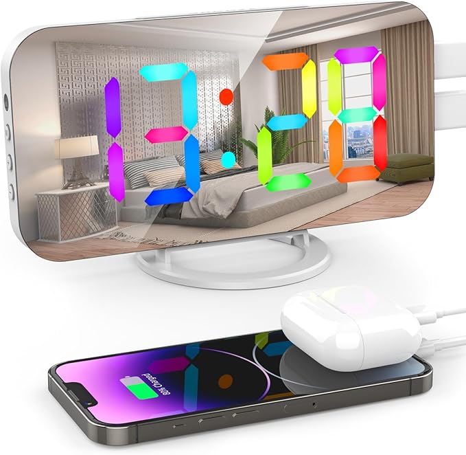 - ⏰ Large Mirror Display & Snooze Function–Made with 7 inch large mirror screen display,you can clearly see the timeanywhere.You can also use the mirror lock for makeup.The big snooze button on the top make you press it easily, even you don’t need open your eyes.
