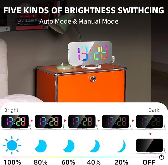 - ⏰ 6 Level Brightness & Auto Dimming– The new alarm clock has 6 different brightness levels,you can manually adjust the brightness, or turn on the automatic adjustment mode.It will automatically dim the brightness according to the light intensity around the alarm clock.