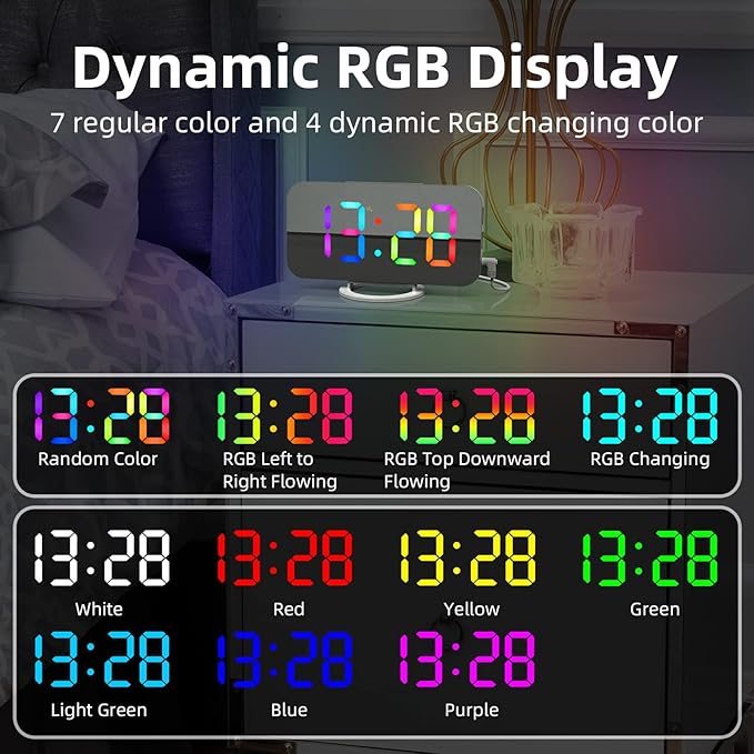 - ⏰ Upgrade New RGB Clock–Our this new RGB clock upgrades to 11 colors display moes(7 regular color and 4 dynamic RGB changing color) that bring you a you a difference color atmosphere.It’s suitable for living room, bedroom, office and home decoration.
