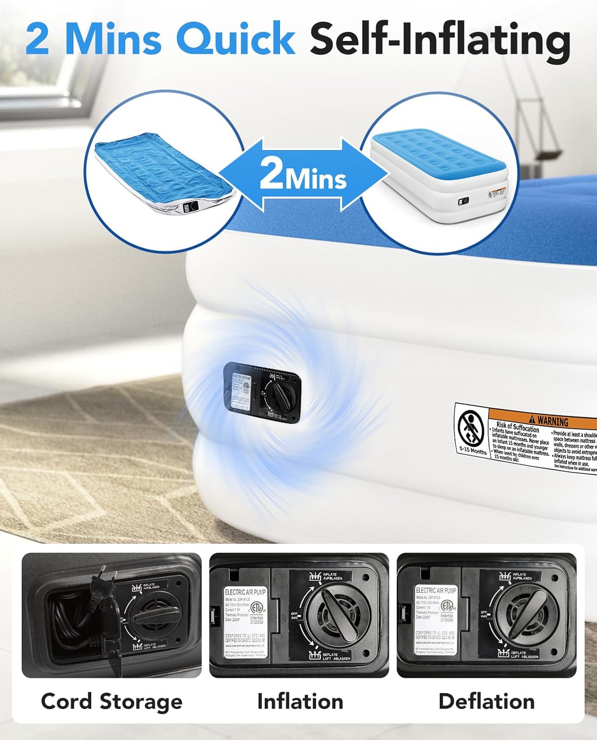 EASY ASSEMBLY – The built-in electric pump inflates the mattress in about 3-4 minutes for complete fixing. In addition, the air mattress can be easily emptied into the handy travel bag provided. Please make sure the rotary knob is fully rotated to inflate or deflate.