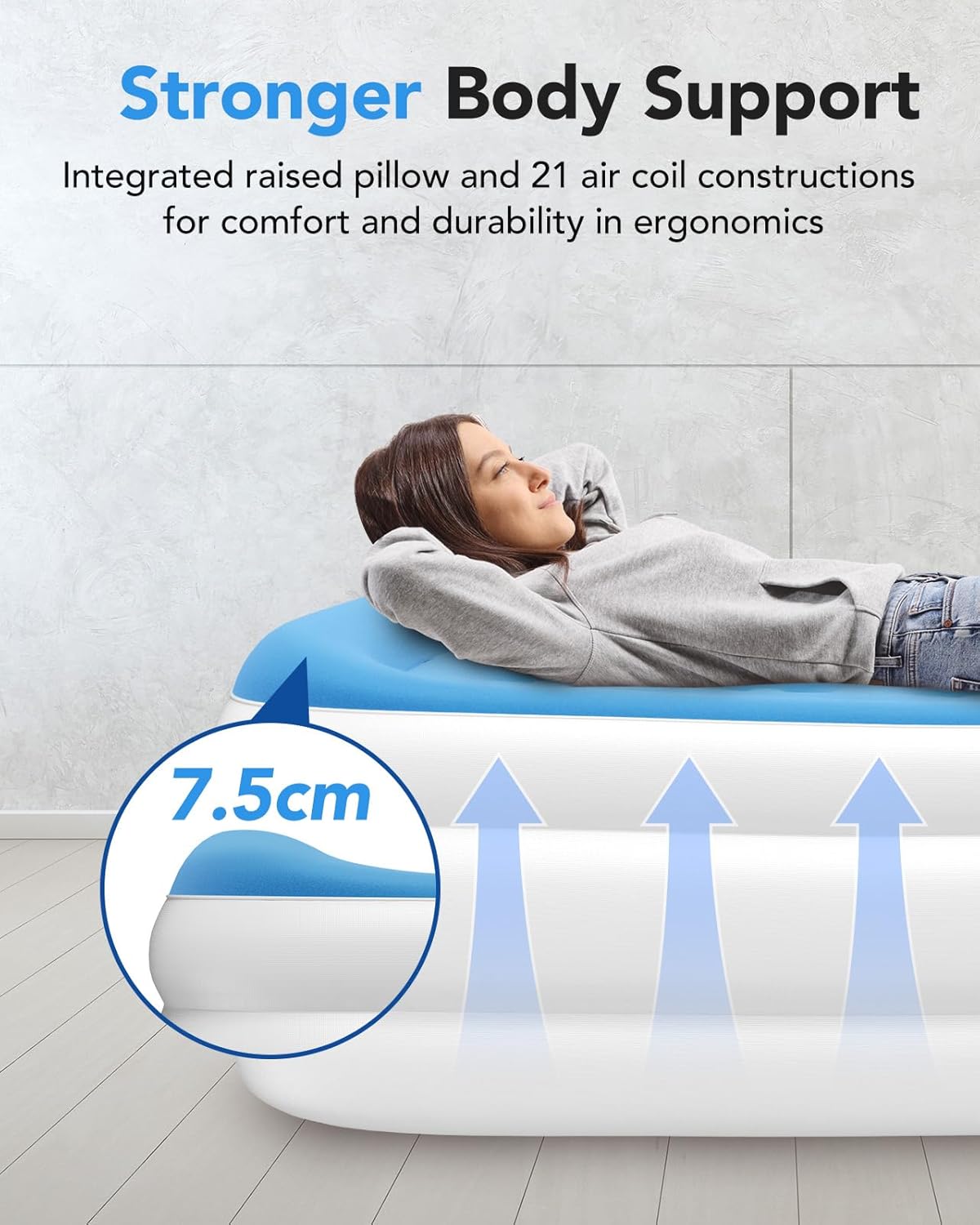 COMFORT & SUPPORT – Airbed designed with internal support structure, multi-layer soft top flocking, supports up to 300 pounds, provides exceptional support and comfort. This advanced support system prevents dents and bumps, which ensures a comfortable sleeping experience.