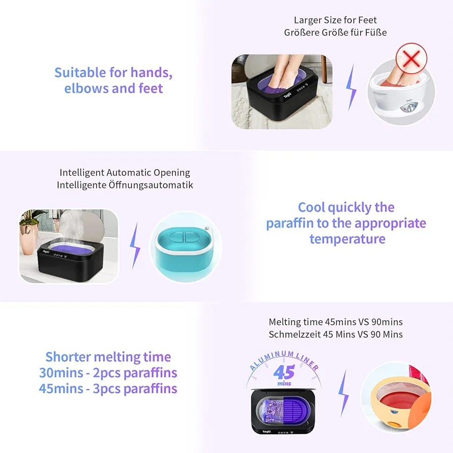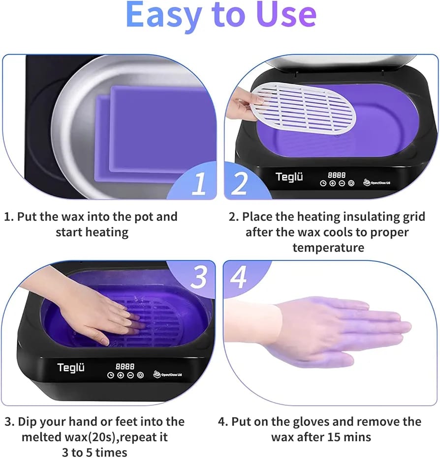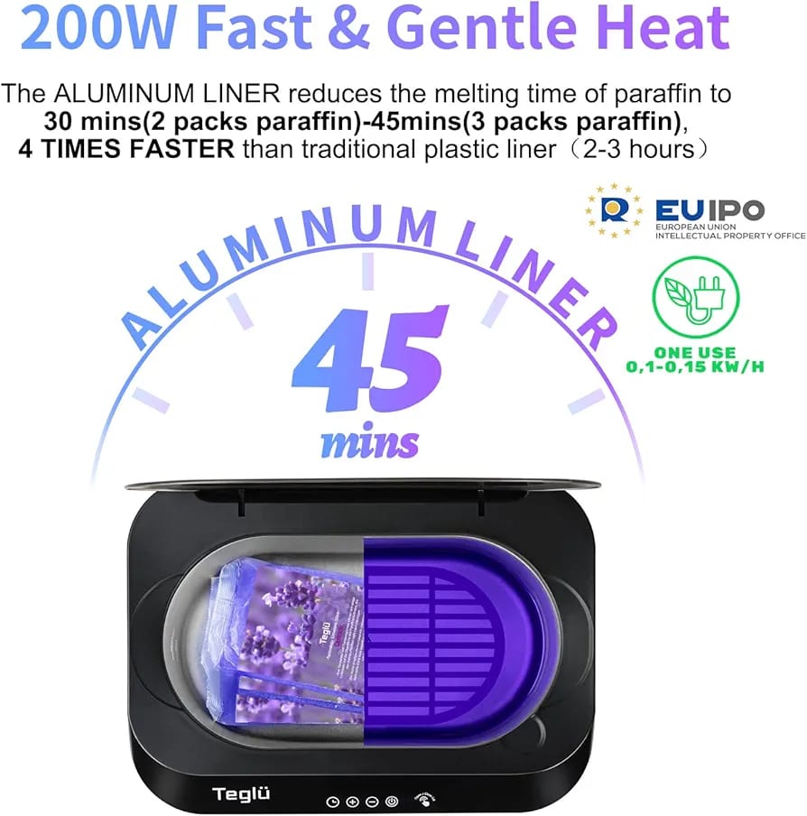 Fast Heating & Melting in 30 MINS: With 150W and NTC temperature control technology, Teglu paraffin bath for hands and feet enable 2 Pack paraffin wax melting in about 30 mins, so you can enjoy your hand wax spa more conveniently