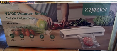 The KEJECTOR Vacuum Sealer Machine, model V3100, is an electric precision vacuum sealer designed to help you extend the freshness of your food. This sleek white appliance, made of durable ABS plastic, is equipped with an automatic sealing mode that ensures a consistent and airtight seal every time. The sealer is suited for a variety of moist foods, and it comes with a roll component to accommodate your sealing needs. Operating at 120 volts and 100 watts, the KEJECTOR V3100 is a reliable addition to any kitchen, allowing you to preserve your meals with ease and efficiency.