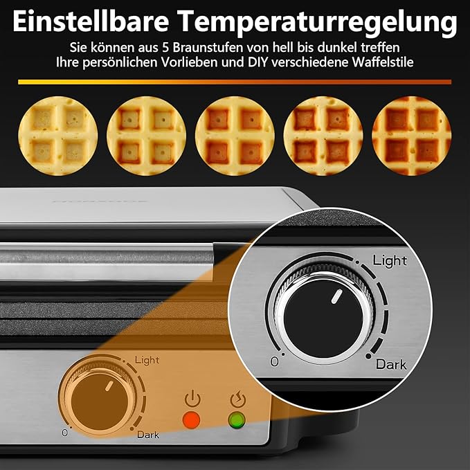 - ADJUSTABLE TAN BUTTON Choose from 5 different browning levels to customize your waffles from light to dark for perfect results every time