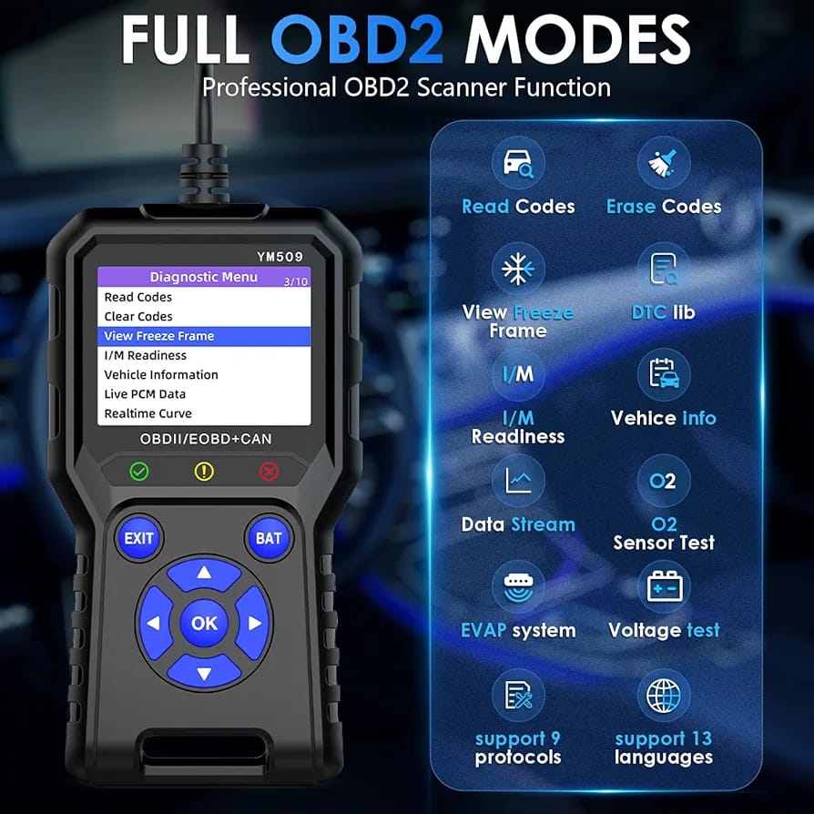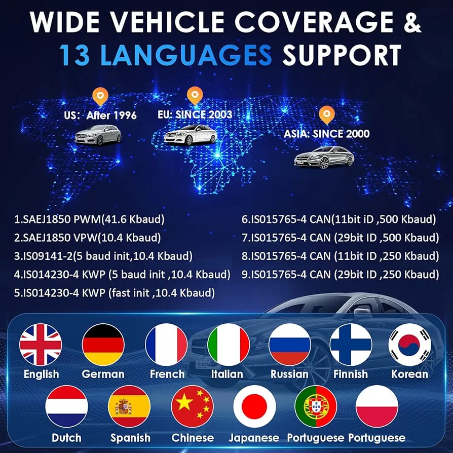 【Wide Vehicle Coverage】OBD-II diagnostic tool, supports 9 main protocols, compatible with most US cars from 1996, EU cars from 2000 and vehicles manufactured in Asia since 2008, supports 13 vehicle languages: Chinese, Polish, Korean, English, Japanese, French, Spanish, Russian, Italian, Finnish, Portuguese, German, Dutch