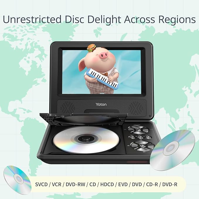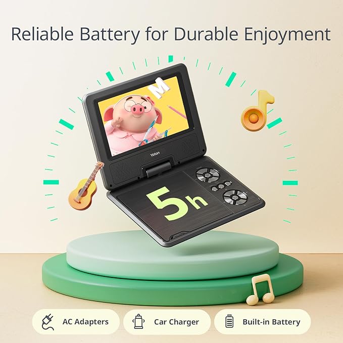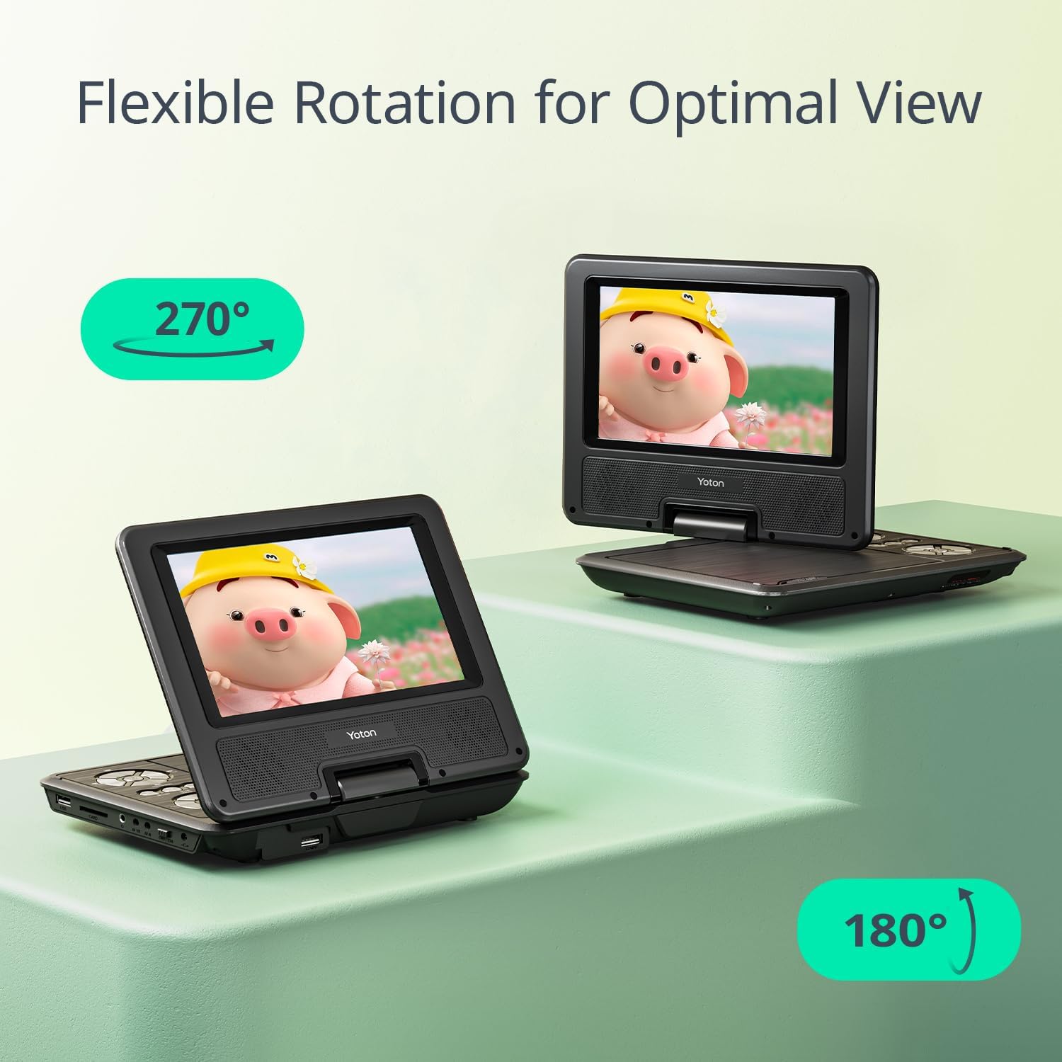 - 【Backseat Theater for Kids】Perfectly sized for travel, Yoton portable DVD player’s 9.5-inch compact body is just right for kids to use—easy to hold in their laps or place on a car seat, while the 7.5-inch screen turns the backseat into a kid-approved theater—keeping them busy so you can focus on driving.